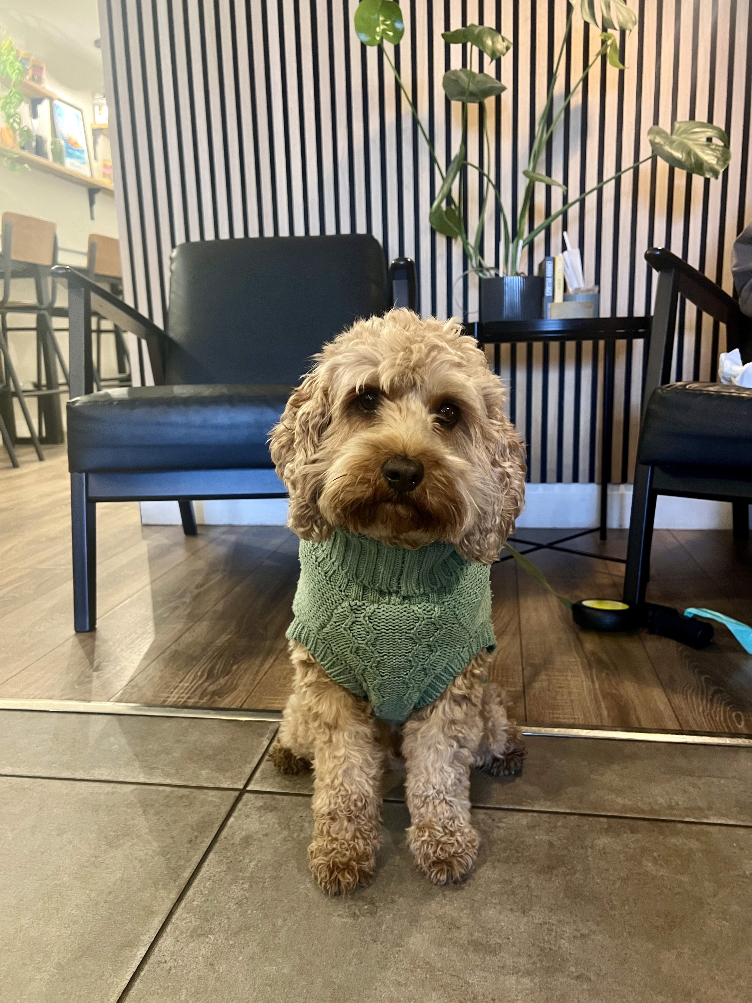 Coco, another of our regulars. Youll often find Coco supporting a knit jumper or a bow tie. The friendliest face you will meet, always greeting you with a very waggy tail.